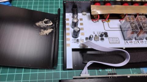 何故か上パネルからリレーが見えます 発光LEDでディスプレー化したPCにインスパイアーされたのか こういう設計者の趣味が不明ですが、面白いと思う人とゴミが入ってしまうと心配する人がいると思います 私は透明なプラ板を貼り付けました リレーの前面側からLEDで照明をするほどのメーカーの趣味?趣向ですね