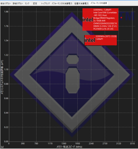 結果のID番号 : Intel Core10W (Cometlake-WS 10C) Host Bridge/DRAM Registers; 2x 16GB AMI CMW32GX4M2E3200C16 DIMM (3.2GHz 128-ビット) PC25600 (x16-20-20)