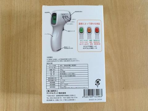 デジタルランド株式会社という輸入代理店が扱っていますが、中身はいかにもありがちな中国製の非接触温度計ですね。