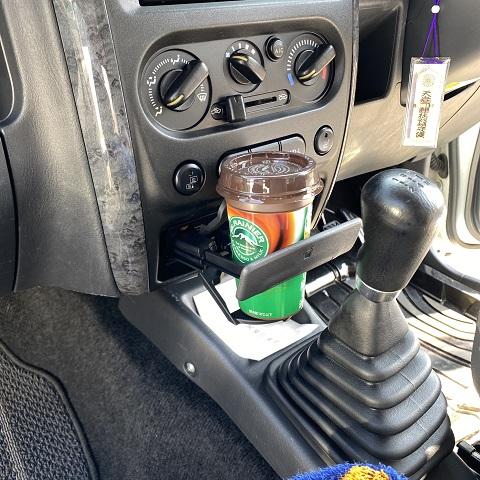 実際にドリンクを置くとドリンクの形状を選んでしまいました。写真のように口が広がったドリンクだと2WD4WDの切り替えスイッチを押してしまいそうで注意が必要です。運転もマニュアル車だと1速時には手を当ててしまいます。シフトレバーの握り方を変えて切り替えるしかありません。握るのではなく手の腹で押すように学習しました。