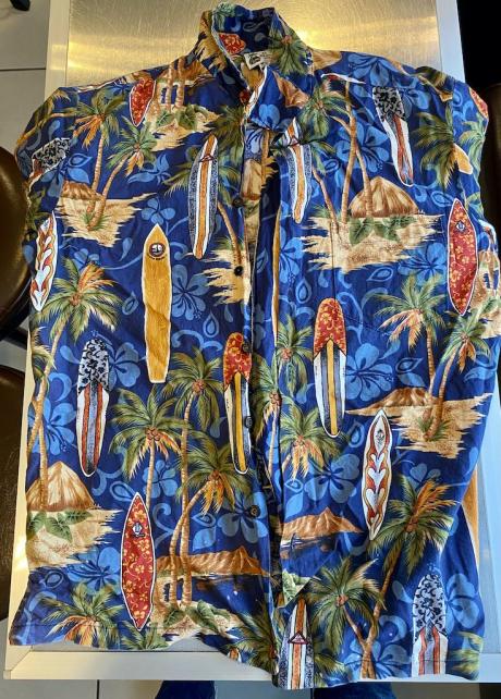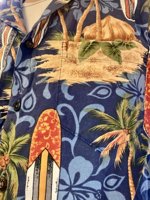 初めてアロハをお求めになるなら、あまり地味なものより、この種の青色ベースのサーフボード柄が