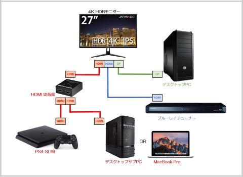 27インチIPS HDR 4Kモニターを4Kテレビ化のため、HDMIx2、DPx1の接続方法でいろいろ考えた