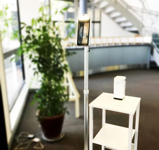 中身をのぞいてみましたが、この機械は、元々、顔認証でドアを開閉するための装置そのままのようです。コロナ需要で急遽カメラと検温機能を追加実装し、元々の機能に触れずに「検温器」という仮面を被せてそのまま販売しているようです。