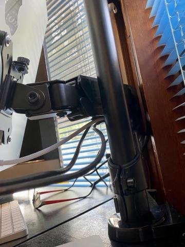長さに余裕のある電源ケーブルは 2本のアームに沿わせる形で収納