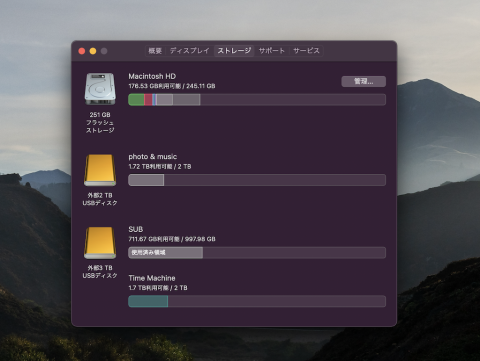 多くの場合、これまで使っていたiMacには256GBを超えるストレージが内蔵されていると思いますので 移行アシスタントを起動する前に、写真や音楽などのファイルを外付けHDDやクラウドに移行させておくことが大事だと思います。