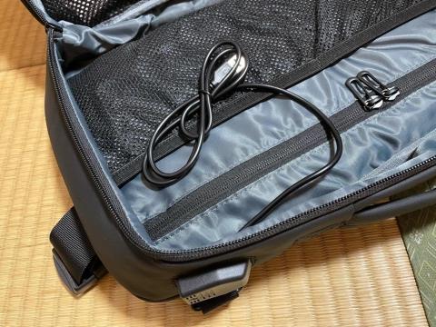 バッグに内蔵されたUSBコネクタ経由でスマホなどを充電することができます