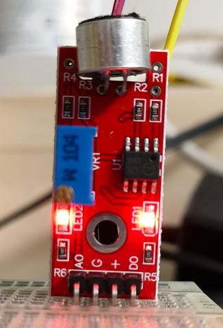 点灯LEDが左右2つあるが、右は電力供給時に点灯するもの、左は音感知時に点灯するものです。