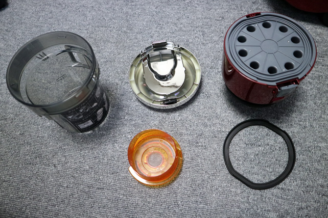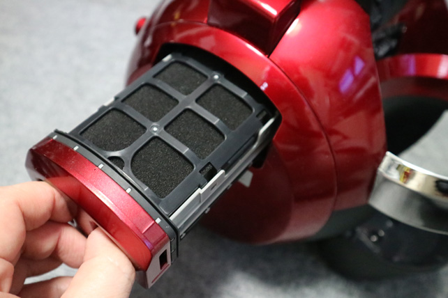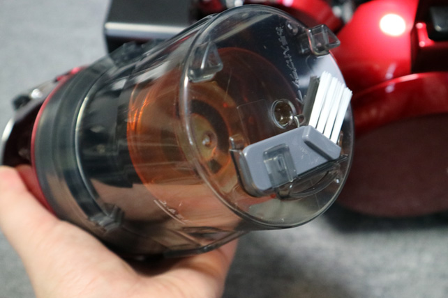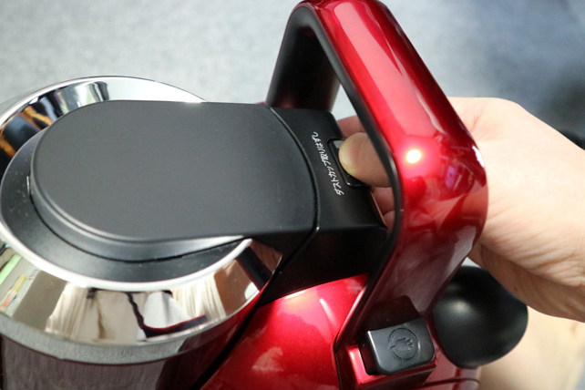 本体のハンドル近くにダストカップの取り外しボタンがあります。