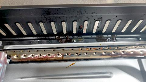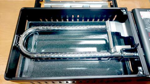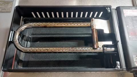 バーナーと食材の間に輻射版があるので、基本的には食材から油が落ちても輻射版から左右に流れ落ちて、そのまま しる受けトレイ に張った水に落ちていく感じで、直接バーナーの火で炙られる事が少ないせいだと思います。