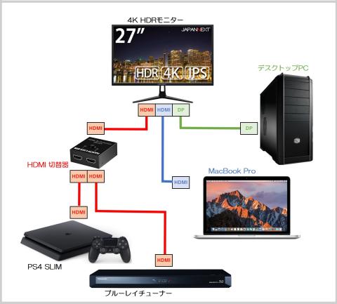 4Kモニターは、JAPANNEXT 27型IPSパネル搭載 4K液晶モニターなのですが、HDMI①・HDMI②・DPの3つのポートが用意されています。