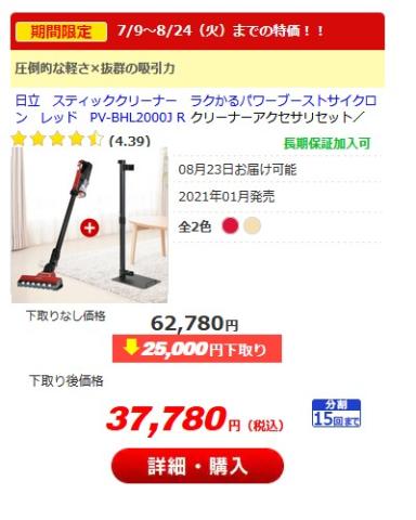 日立スティッククリーナーラクかるパワーブーストサイクロン PV-BHL2000J