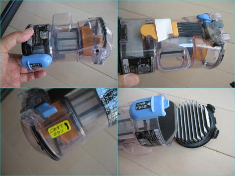 下画像でノズルで吸い上げた塵は↘右上画像の穴から出てきます フィルターを通してオレンジ色の部分にゴミは集められます 髪の毛は↙左上のボンボリ状のフィルターに絡まります 一部の綿埃などはブラシなどで掻き出さないと出ませんね ゴミの量も1回でも結構たまるのでゴミ収納部は意外に容積が無いです こまめに掃除しないと詰まりますし、ゴミ捨て時に細かい埃が散らばります 私としては昔のようなゴミパックが面倒が無くて良いですが、サイクロン方式は吸い込み量が無いと機能しないのでゴミパックは無理なのでしょう 掃除中はヘッド部のLEDが点灯します
