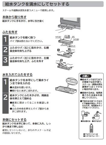 加熱水蒸気というのはレンジ下の給水タンクに水道水を入れて準備するようです