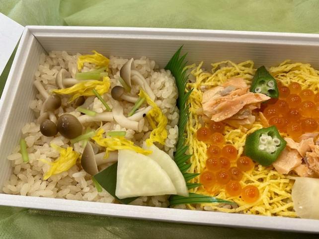 秋らしい炊き込みご飯 いくらを散らした海鮮系 きちんとバランで仕分けられてます。