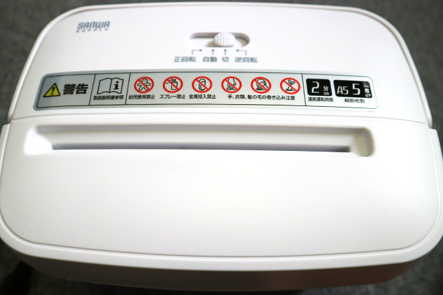 A5 5枚までがいちどにシュレッドできます。A4用紙なら2枚分を半分に折ってジャーっと。