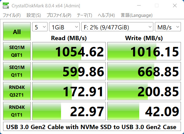 このケーブルを使って、NVMe PCIe 3.0 x4 M.2 SSDをUSB 3.0 Gen2で入出力するSSDケースに入れて、DiskMarkを走らせてみました。