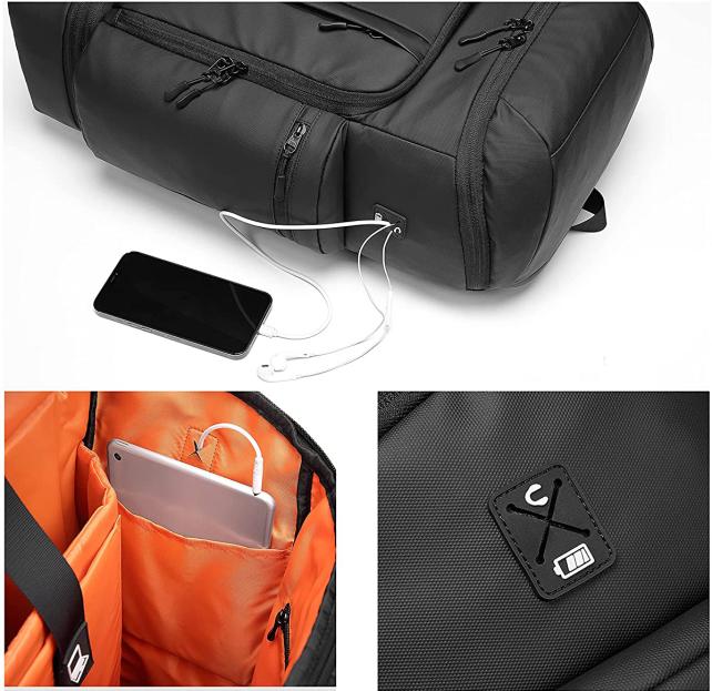 また、メイン収納の内側には、サイドポケットが左右にあり、その左側の上部には、外部に通じる孔があるので、モバイルバッテリをメイン収納のサイドポケットに入れて、外部にケーブルを出して、手元のスマートフォンを充電することができます。(有線のヘッドフォンも通せる)