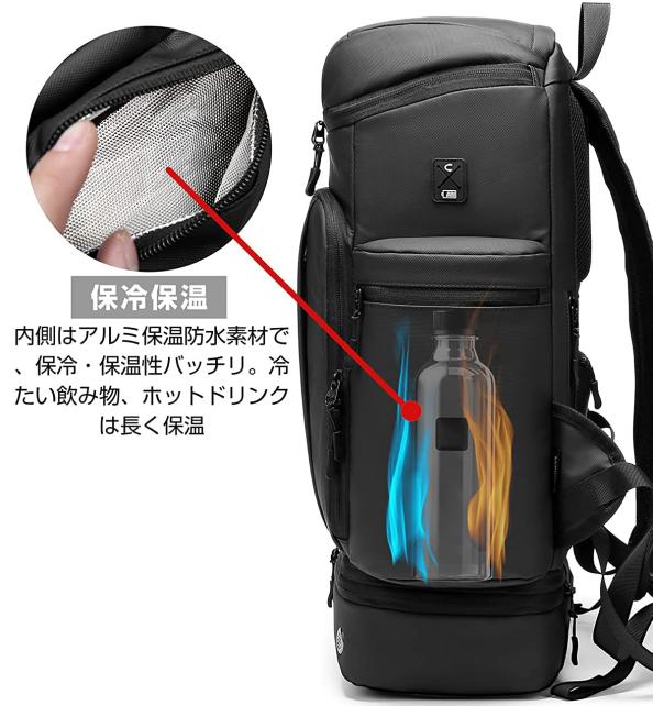 左右には、防水で、保温/保冷効果のある縦長のポケットがあり、ペットボトルや、折り畳みの傘を入れることができます。