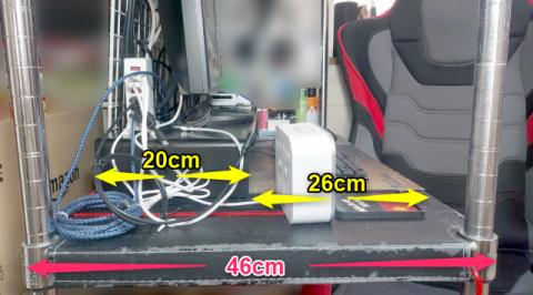 外寸46cmの奥行きの後ろギリギリに机上ラックを置いて、手前に26cmのエリアを確保。