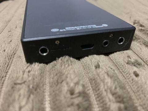 出力端子は3.5mmシングルエンド,2.5mm4極バランスのヘッドフォン出力が各1系統、3.5mmシングルエンド/同軸デジタル兼用のライン出力端子が1系統となります。充電およびデータ転送に対応するmicroUSB B端子が中央にありますね。