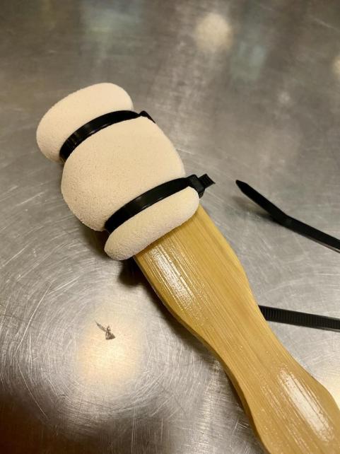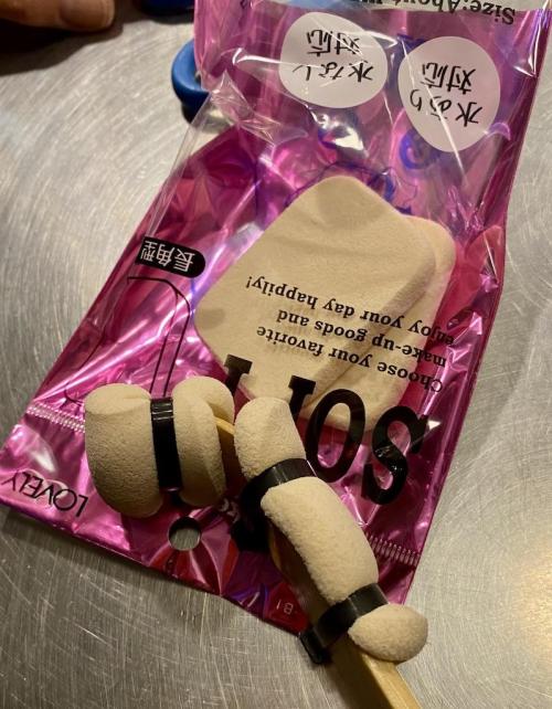 そこで 化粧パフを孫の手に付けよう そう思い立ちました。