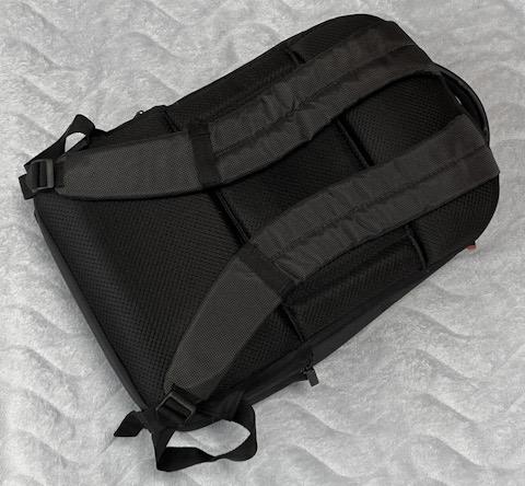 色がブラックなので、スーツに合わせても全く違和感はありません。背負った時の印象としては、安定感がありホールド感も悪くないです。ただ、個人差があるかも知れませんが、ショルダーベルトが開き気味な感じがするので、左右のベルトを引き寄せて止めるチェストストラップが欲しくなります。