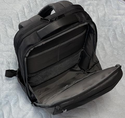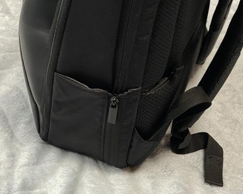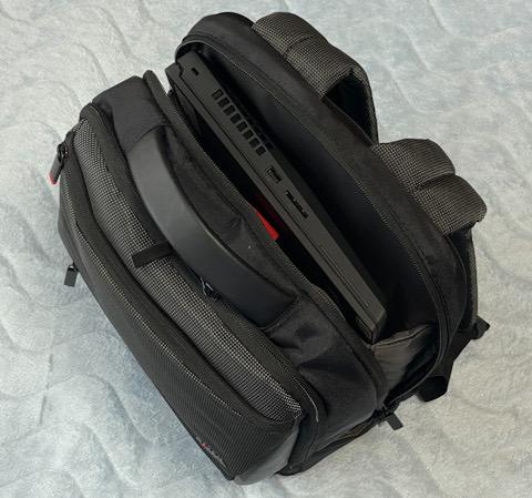パソコンは背中に近い収納スペースに入れます。15.6型で厚み24.5ミリのP15が何の抵抗もなくスルスルっと入ります。さすが純正品、相性はとてもよさそうです。そしてさらにもう一台、タブレットやウルトラブックくらいなら軽く入ると思います。
