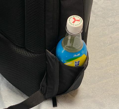 さらに収納スペースとしては正面の赤いラインが入った部分と背中に当たる部分に2箇所、両サイドにドリンクなどが入れられるポケットがついています。