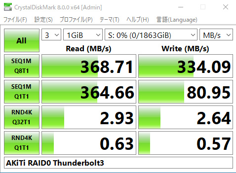 その状況でThunderbolt3外付けRAIDケースでのHDDX2での速度がどこまで出るのか試そうと購入しました。