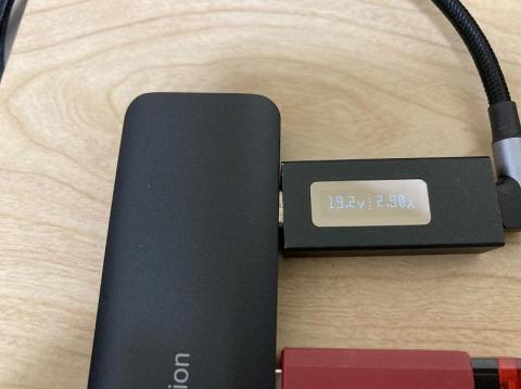 こちらのACアダプタとの組み合わせで60W給電できました。
