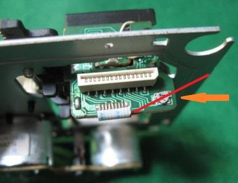 また緑矢印と茶色矢印はコネクターなので手を入れて外します その時ピックアップアッシー部のフレキを切らない、壊さないようにします