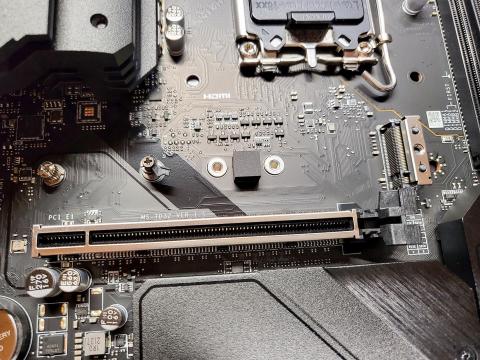 上位機種のマザーボードには、ヒートシンクだけでなく、M.2スロットの裏面も冷やせる様にマザーボード側にも熱伝導シートが取り付けられていて、より温度をさげる効果が期待できますが、Z690のマザーの中では安価な部類に入る本商品にはヒートシンク側だけにしか熱伝導シートが付いていません。