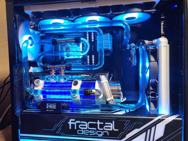 出来上がると、想定していた通り、配管とファンが良い感じに光って、光物のないマザーは背景と同化してシックな感じがします。