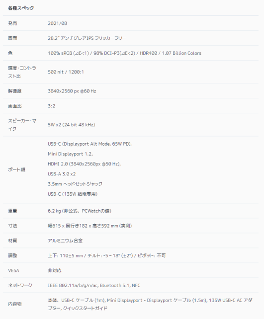 これなら 28インチ3:2でDPI150%換算で2560x1706pxなので、十分代替になるのではないかと考えた次第です。USB-C PD 65W 給電の機能やUSBハブ、Bluetooth等も魅力であると感じました。