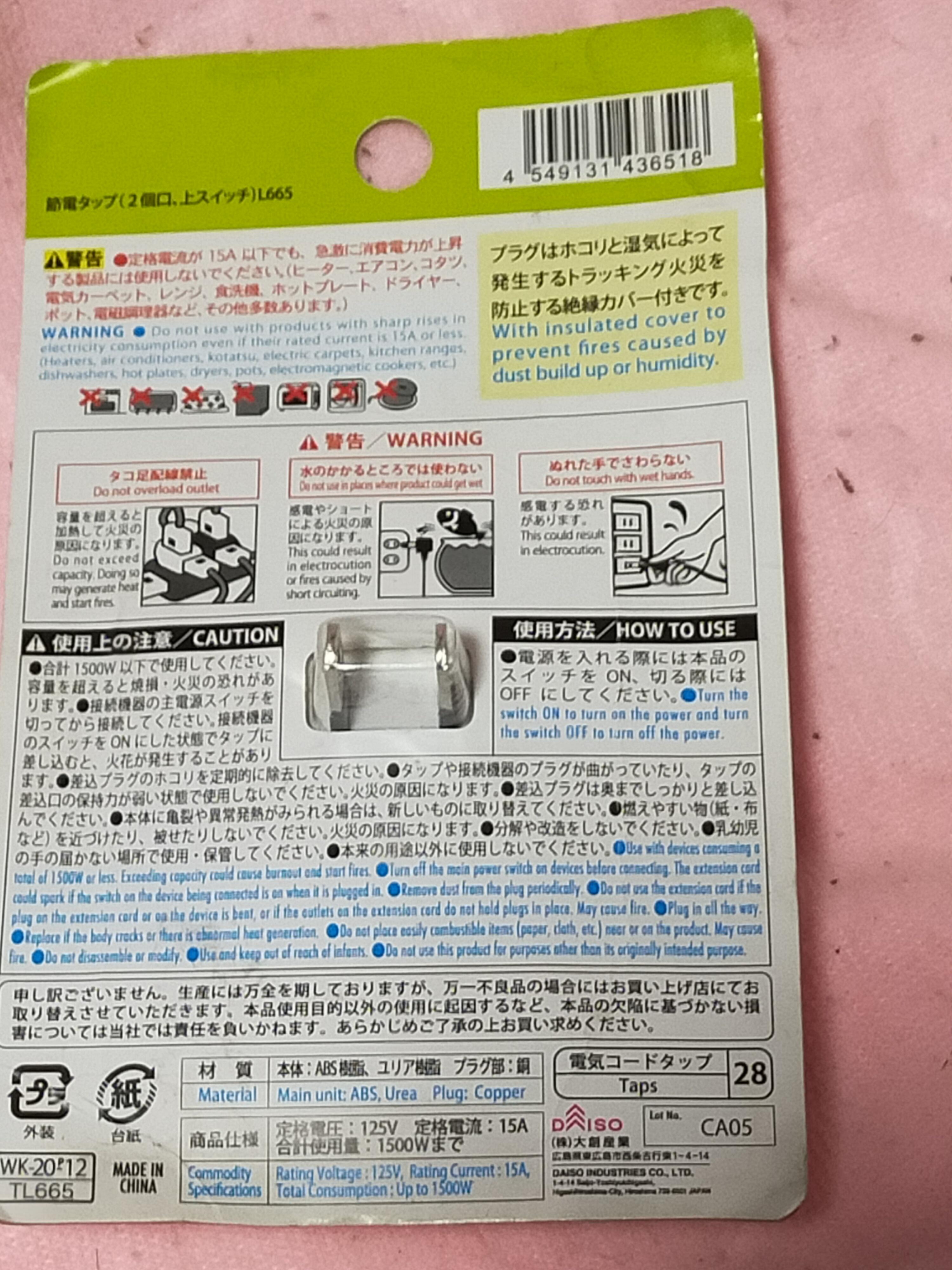 ごめんなさい、100均で節電タップ(2個口、上スイッチ)L665