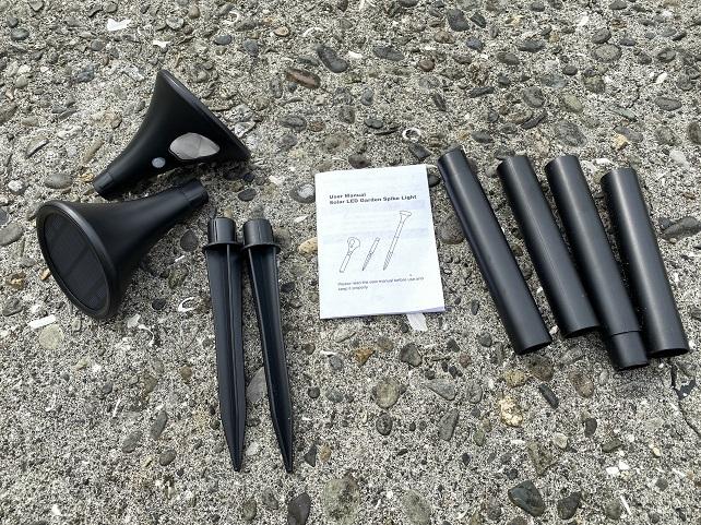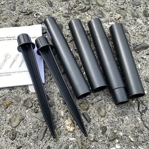 照明本体と突き刺す杭、それに高さ調整できる延長パイプ2本が1セットの物です。