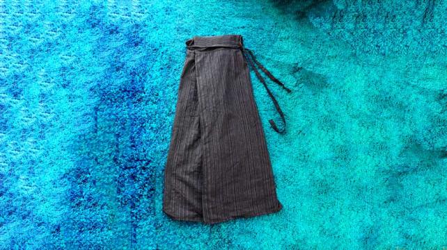 きっちりと折り目が付くのでずり落ちにくく、もともと巻き付けて履くものなので違和感もないです。腰の折り目で裾の上げ下げは調節できるのですが、サイズ感には万能感があります。