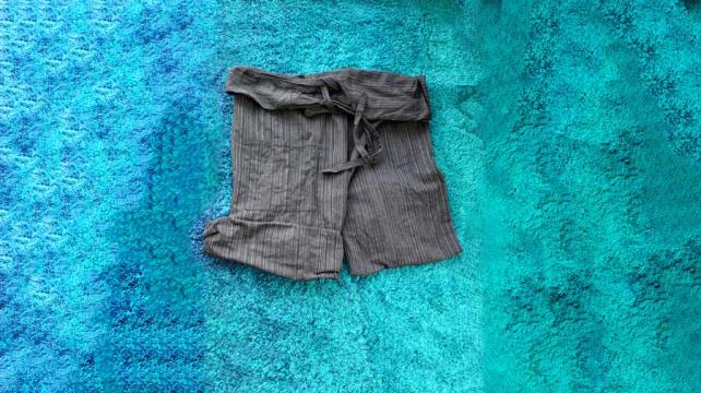 ぶかぶかのパンツに脚を入れ、余った両腰部分の布を身体に巻き付けうように前方に折って畳み、背面の腰のあたりに付いている紐をぐるりと正面に持って布を絞るように縛って固定するだけ。