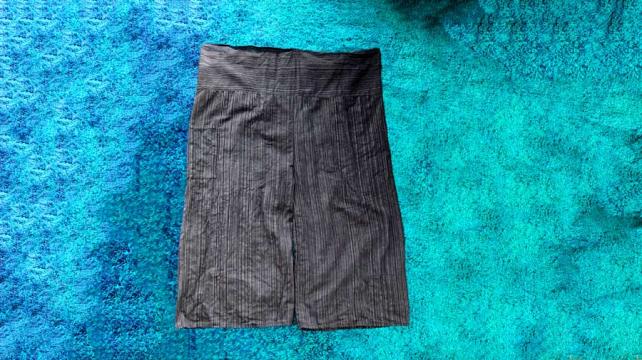 余った布の折り畳み方の比率を変え、片側を大きく折り曲げて巻き付けるようにすると、巻きスカートのような形にもなります。
