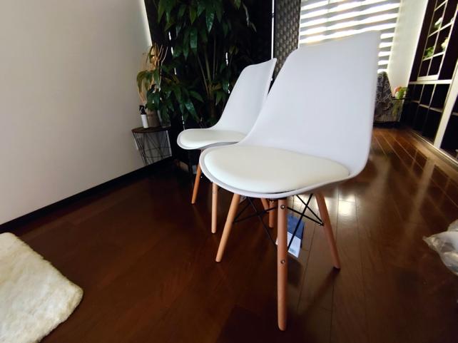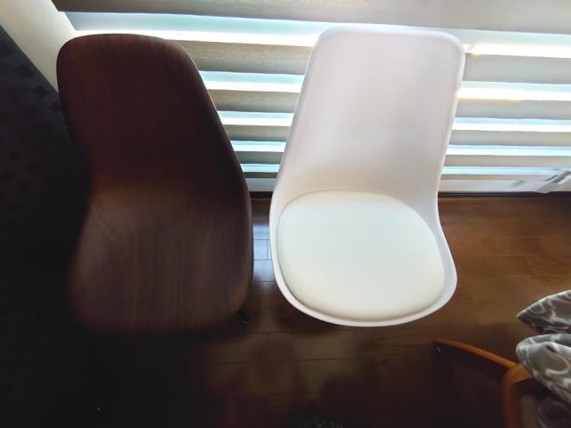 イームズの座面はゆるやかなカーブなのに対して、コストコはスプーンみたいな座面です。少し腰を落とせる感じ。