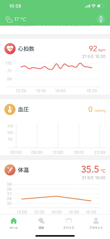 体温のログ。ちょっと低めに出てるっぽい。まぁ専用の体温計と違い腕時計ですからね。