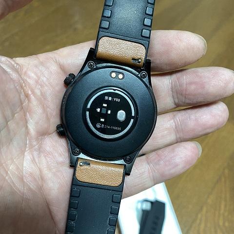 裏側は充電用の接点と各種センサー。体温・血圧・脈拍など計測してロギングし記録して時計本体以外にスマホでも確認できます。会社で実施している毎日の検温作業も必要なくなりました。履歴も残っているのでこれは実に嬉しい機能。