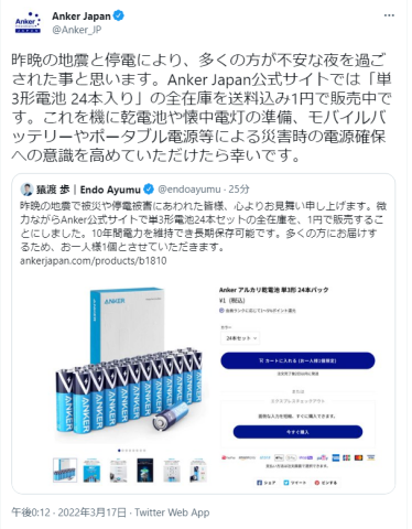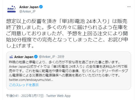 続けて、AnkerJapan公式アカウントからも