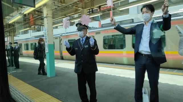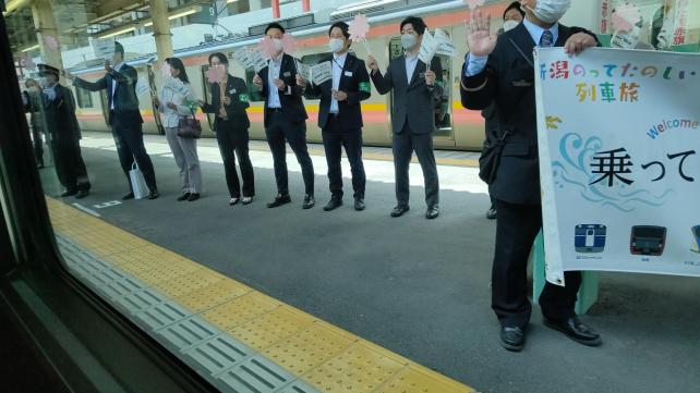 発車時にはJR東 新潟支社(スーツ組)の方や、新潟駅(制服組)の方が集まって見送ってくれました。 海里・臨時海里(桜海里・紅葉海里)共にこの行事?が行われます。