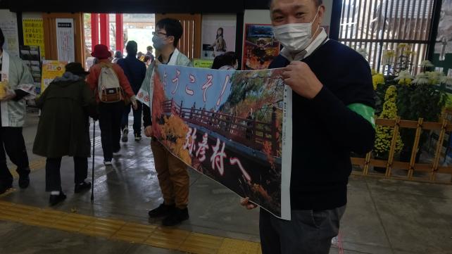 運行当日(2021年11月10日 水曜日)は架線を切られる事故で到着が大幅に遅れましたが弥彦村役場の方からの出迎えがありました。