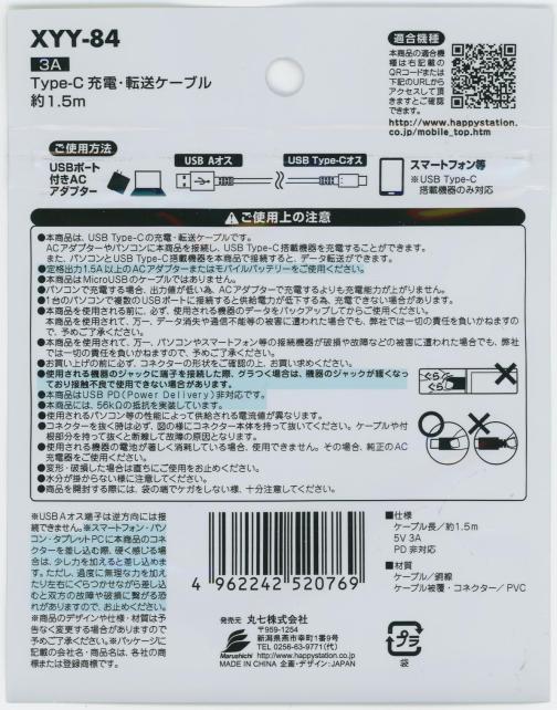 このケーブルは、1.5m長で、最大3Aの電流を流せることがパッケージに記載されています。