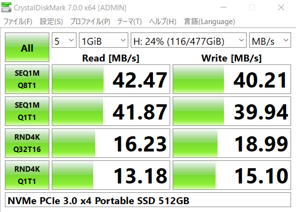 一方、転送速度は、充分高速な、SSDをデスクトップPCに接続して計測しましたが、USB 2.0相当の転送速度でした。