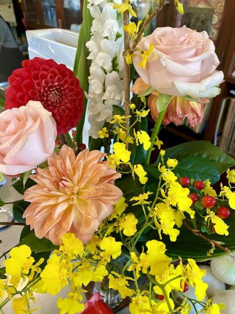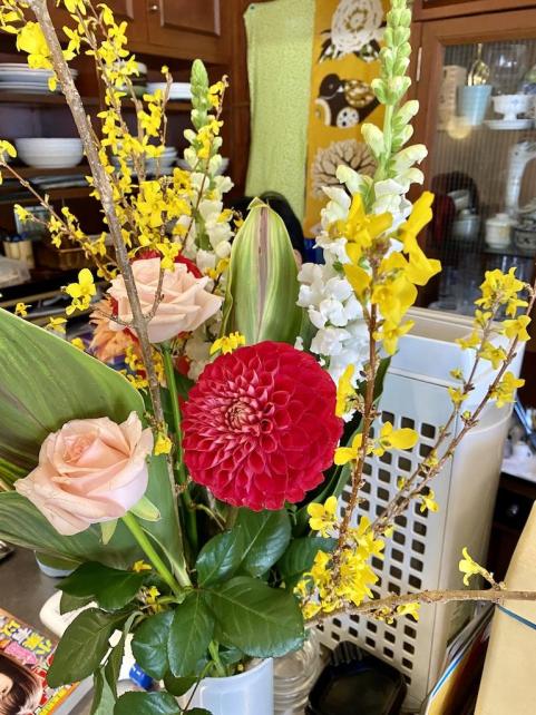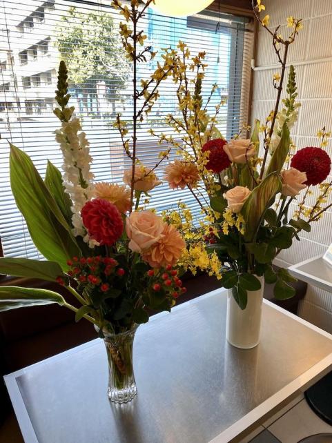 大きな花瓶は 倒れる可能性が高まるので、2つの花瓶に分けて活けることにします。