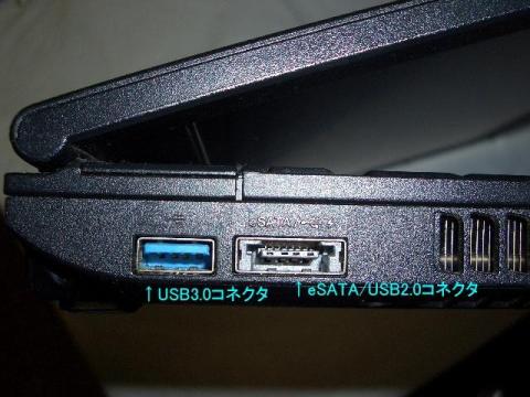 左側面のポート類は、左からUSB3.0コネクタ、eSATA/USB2.0コネクタ