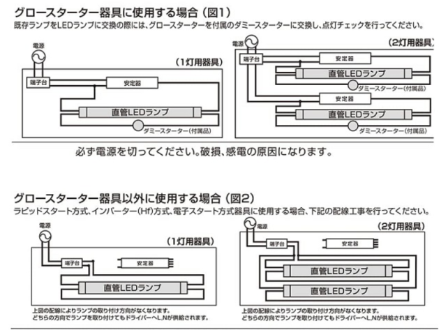 交換は本当に簡単で、グロースターターの場所にダミースターター(直結用のスターター)を入れて、普通の蛍光灯のようにはめ込むだけです